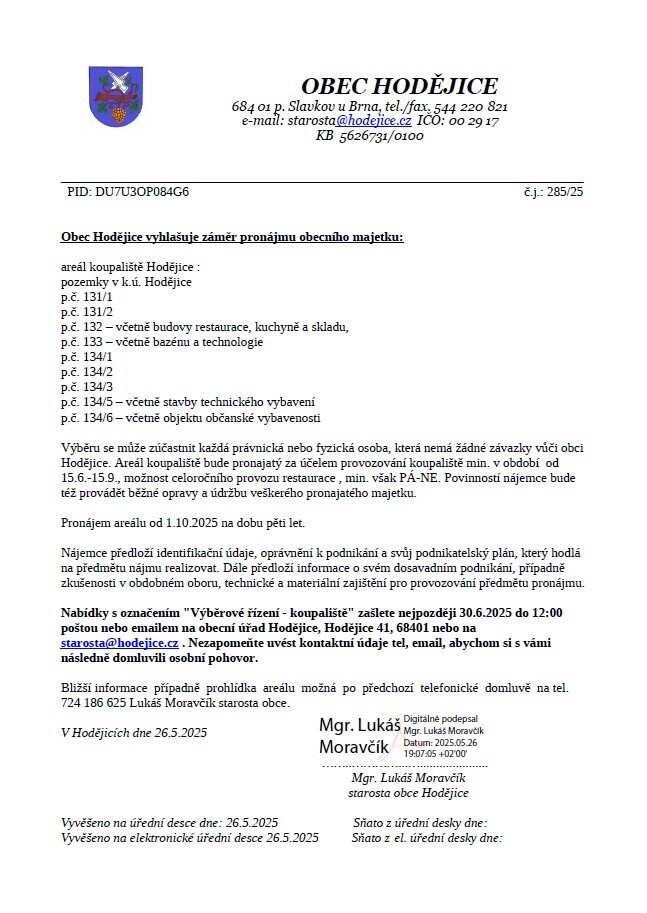 Záměr obce Hodějice na pronájem koupaliště