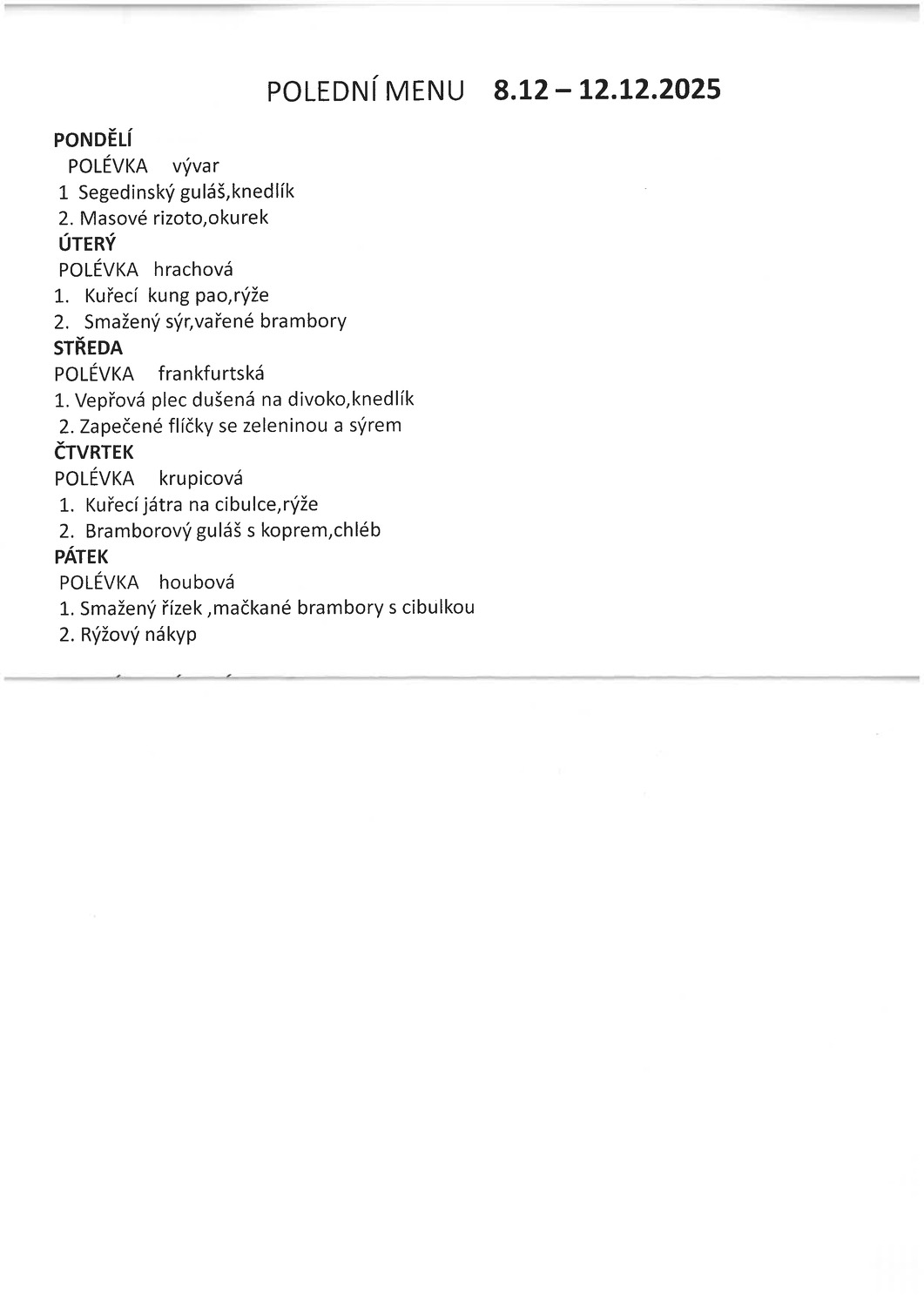 Jídelní lístek 8.12.-12.12. Restaurace pod Tvrzí